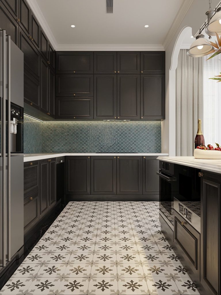 Hệ tủ bếp sử dụng màu tối tạo cảm giác sang trọng và sạch sẽ. Mặt bếp bằng đá giúp tăng độ bền và dễ vệ sinh trong quá trình sử dụng. Phần tường bếp được ốp gạch họa tiết, vừa tạo điểm nhấn, vừa giúp bảo vệ bề mặt khỏi dầu mỡ.