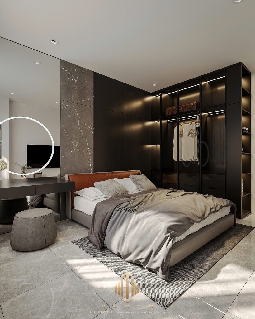 Phong cách chủ đạo của căn hộ là modern luxury, kết hợp giữa gam màu trầm và vật liệu cao cấp như đá, kính và kim loại. Hệ thống ánh sáng được bố trí khoa học nhằm tạo chiều sâu và điểm nhấn cho không gian.