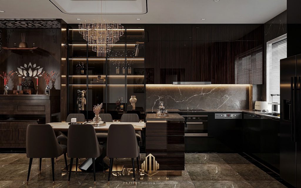 Khu bếp được thiết kế hiện đại với hệ tủ bếp đồng bộ, mặt đá cao cấp và hệ đèn LED âm tủ. Bàn ăn được bố trí hợp lý, kết hợp đèn trang trí tạo điểm nhấn cho toàn bộ không gian.